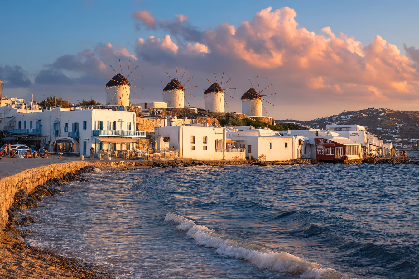 Las islas griegas disfrutan de clima mediterráneo seco. La época ideal es de mayo a octubre, con temperaturas entre 22 y 32°C, cielos despejados y prácticamente sin lluvias. El verano puede ser caluroso, pero la brisa del Egeo lo hace muy llevadero. Recomendamos ropa ligera, bañador, protección solar y calzado cómodo.